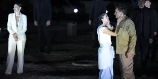 Δυο Ούγγροι ηθοποιοί παίζουν ένα ζευγάρι μαύρα άλογα και αφηγούνται την ιστορία του Μίκαελ Κόλχαας, σε μια χωμάτινη σκηνή.