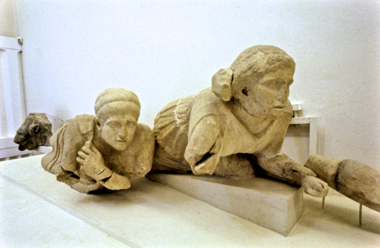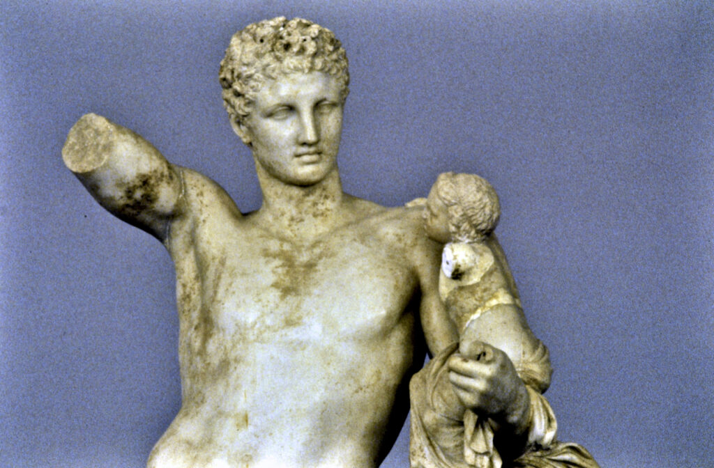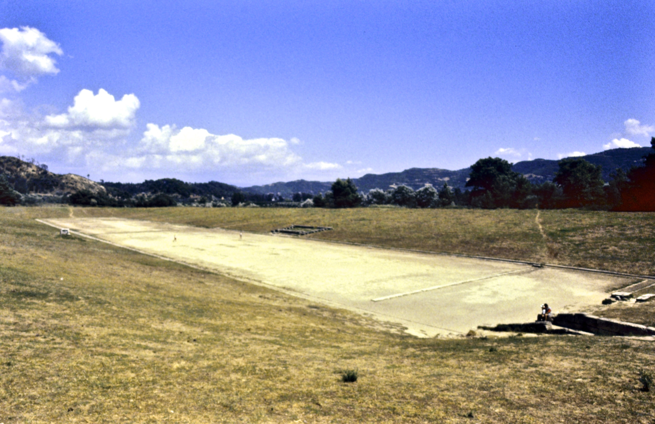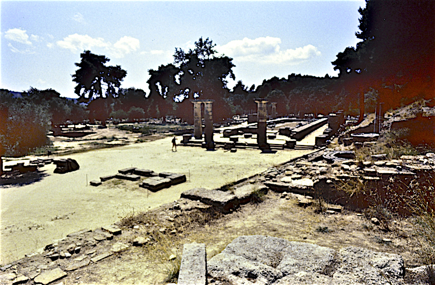 [Φωτογραφίες από το αρχείο μου. Αρχαία Ολυμπία: Το Στάδιο, ο ναός της Ήρας, ο Ερμής του Πραξιτέλη και δυο φιγούρες σε αέτωμα, που μοιάζουν με μέλη χορού αρχαίας τραγωδίας, από μια φωτογράφιση με slides, τον Ιούλιο του 1991, τότε που παίξαμε την Ιφιγένεια στην Αυλίδα, στην πλησίον Ίλιδα.]
