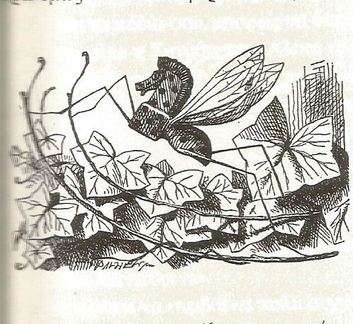 «Μάλιστα! Είπε η Σκνίπα. Αν κοιτάξεις σ’ αυτό τον θάμνο, θα δεις μια Κουνιστή Αλογόμυγα. Είναι φτιαγμένη ολόκληρη από ξύλο και πάει τραμπαλίζοντας από κλαδί σε κλαδί».