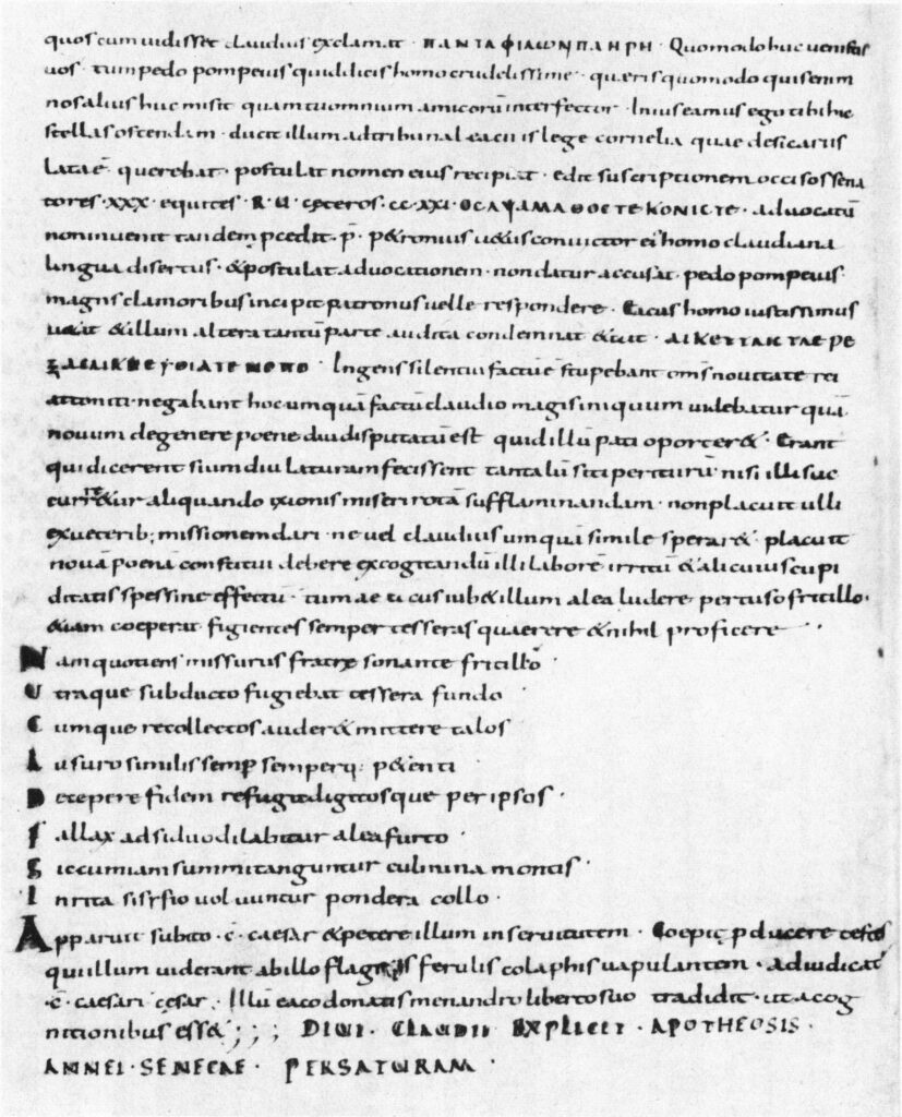 Hic, p.c., qui vobis non posse videtur muscam excitare, tam facile homines occidebat, quam canis adsidit. Sed quid ego de tot ac talibus viris dicam? Non vacat deflere publicas clades intuenti domestica mala … Dic mihi, dive Claudi, quare quemquam ex his, quos quasque occidisti, antequam de causa cognosceres, antequam audires, damnasti? Hoc ubi fieri solet? In caelo non fit. “Ecce Iuppiter, qui tot annos regnat, uni Volcano crus fregit, quem ῥίψε ποδὸς τεταγὼν ἀπὸ βηλοῦ θεσπεσίοιο et iratus fuit uxori et suspendit illam: numquid occidit? … Pedibus in hanc sententiam itum est. Nec mora, Cyllenius illum collo obtorto trahit ad inferos, a caelo illuc unde negant redire quemquam. Dum descendunt per viam sacram, interrogat Mercurius, quid sibi velit ille concursus hominum, num Claudii funus esset. Et erat omnium formosissimum et impensa cura, plane ut scires deum efferri: tubicinum, cornicinum, omnis generis aenatorum tanta turba, tantus concentus, ut etiam Claudius audire posset. Omnes laeti, hilares: populus Romanus ambulabat tanquam liber, Agatho et pauci causidici plorabant, sed plane ex animo. Iurisconsulti e tenebris procedebant, pallidi, graciles, vix animam habentes, tanquam qui tum maxime reviviscerent. Ex his unus cum vidisset capita conferentes et fortunas suas deplorantes causidicos, accedit et ait: “dicebam vobis: non semper Saturnalia erunt.” Claudius ut vidit funus suum, intellexit se mortuum esse. Ingenti enim μεγάλῳ χορικῷ nenia cantabatur anapaestis: