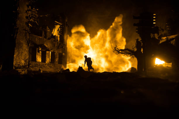 War Concept. Military silhouettes fighting scene on war fog sky background, World War Soldiers Silhouette Below Cloudy Skyline At night. Battle in ruined city. Selective focus