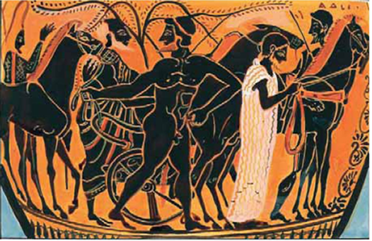 Ο Αχιλλέας σέρνει το νεκρό σώμα τού ΄Εκτορα. Αριστερά ο Πρίαμος και η Εκάβη θρηνούν. Η φτερωτή ΄Ιριδα σπεύδει να μεταφέρει το μήνυμα τού Δία. (Μελανόμορφη υδρία. 6ος αι. π. Χ.)
