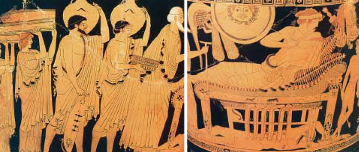 Ο Πρίαμος έχει έρθει μπροστά στον Αχιλλέα, για να τον ικετέψει να του παραδώσει το κορμί τού νεκρού ΄Εκτορα που βρίσκεται παρατημένο στο έδαφος. Πίσω από τον Πρίαμο δούλοι και δούλες σηκώνουν τα λύτρα, πολύτιμα αγγεία και κασέλες με θησαυρούς. Ερυθρόμορφος σκύφος (περ. 485-480 π. Χ.)
