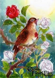 «Λοιπόν, ας θες ένα κόκκινο ρόδο πρέπει σε νύχτα πανσελήνου να το δημιουργήσεις εσύ η ίδια με τη μουσική και μετά να το βάψεις κόκκινο με το ίδιο το αίμα της καρδιάς σου. Κι αυτό για να συμβεί πρέπει όσο κελαηδάς να ακουμπάς το στήθος σου πάνω σε ένα αγκάθι μου. Κι όλη τη νύχτα πρέπει να μου τραγουδάς ώσπου το αγκάθι να φτάσει βαθιά και να τρυπήσει την καρδιά σου. Το αίμα σου πρέπει να τρέξει μέσα στις δικές μου φλέβες, πρέπει να γίνει ο δικός μου χυμός»