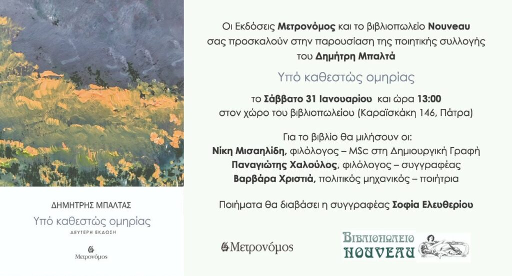 Πρόσκληση: Οι εκδόσεις Μετρονόμος και το βιβλιοπωλείο Nouveau στην Πάτρα σας προσκαλούν στην παρουσίαση του βιβλίου “Υπό καθεστώς ομηρίας” του Δημήτρη Μπαλτά. Στις 31 /1 /26, ώρα 13.00