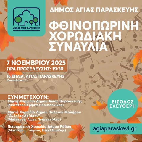 ΠΡΟΣΚΛΗΣΗ στη Φθινοπωρινή χορωδιακή συναυλία του Δήμου Αγίας Παρασκευής: Στις 7 /11 / 25, 19.30, στο 1ο ΕΠΑΛ Αγίας Παρασκευής