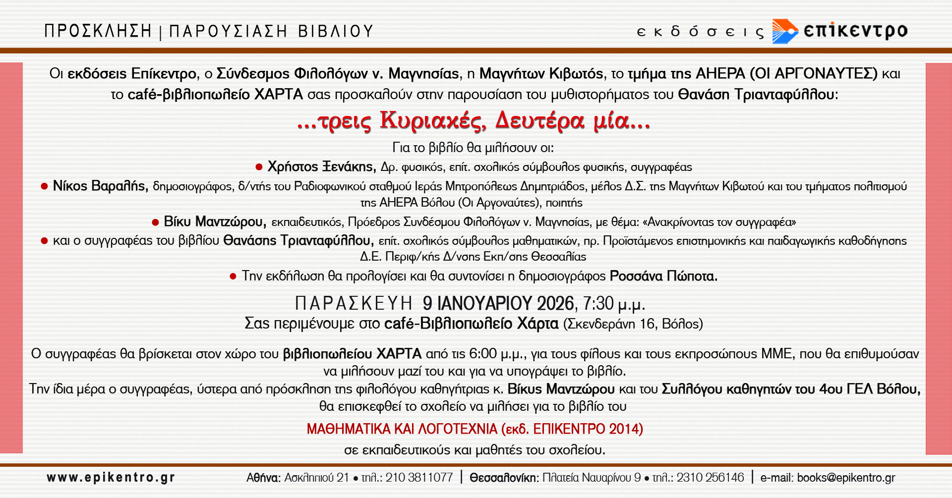 Ευχαριστώ πολύ, Παυλίνα, για την προβολή της παρουσίασης του βιβλίου μου “…τρεις Κυριακές, Δευτέρα μία… στη ΧΑΡΤΑ του Βόλου, την επόμενη Παρασκευή , 9/1/26….