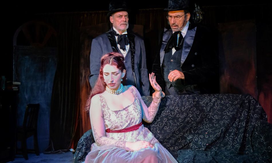 Καθώς εισερχόμαστε στη χαμηλοτάβανη θεατρική αίθουσα η αισθητική αφοπλιστικά η ίδια: κόκκινο βελούδο και καθρέφτες. Νομίζω πως ξεχωρίζω πάνω ακριβώς από το κεφάλι μου, ανάμεσα σε άλλα έργα, ζωγραφισμένο στην οροφή το Μάθημα χορού του Ντεγκά. Καθόμαστε στη δεύτερη σειρά. Η μικρή ιταλική σκηνή είναι τόσο κοντά μας, μια ανάσα απόσταση, που θέλεις να ανέβεις. Νομίζεις ότι ο νοητός τέταρτος τοίχος καταργείται και μαζί του η απόσταση που χωρίζει την πραγματικότητα της πλατείας από τη σύμβαση της σκηνής. Τόση αισθητική διέγερση και ακόμη δεν έχει ξεκινήσει καν η παράσταση: Τα άσπρα άλογα / Ρόσμερσχολμ του Ερρίκου Ίψεν, σε σκηνοθεσία και μουσική επιμέλεια της Βαλεντίνης Λουρμπά, μετάφραση του Ερρίκου Μπελιέ, τα στοιχεία των υπόλοιπων συντελεστών, φωτιστή, ενδυματολόγου, βοηθού σκηνοθέτη, μαζί με το πλήρες κείμενο του έργου και φωτογραφίες των πέντε ηθοποιών (ο Χρίστος Γεωργίου παίζει δύο ρόλους) είναι ό,τι περιλαμβάνει το πρόγραμμα στο μικρό ασπρόμαυρο βιβλιαράκι.