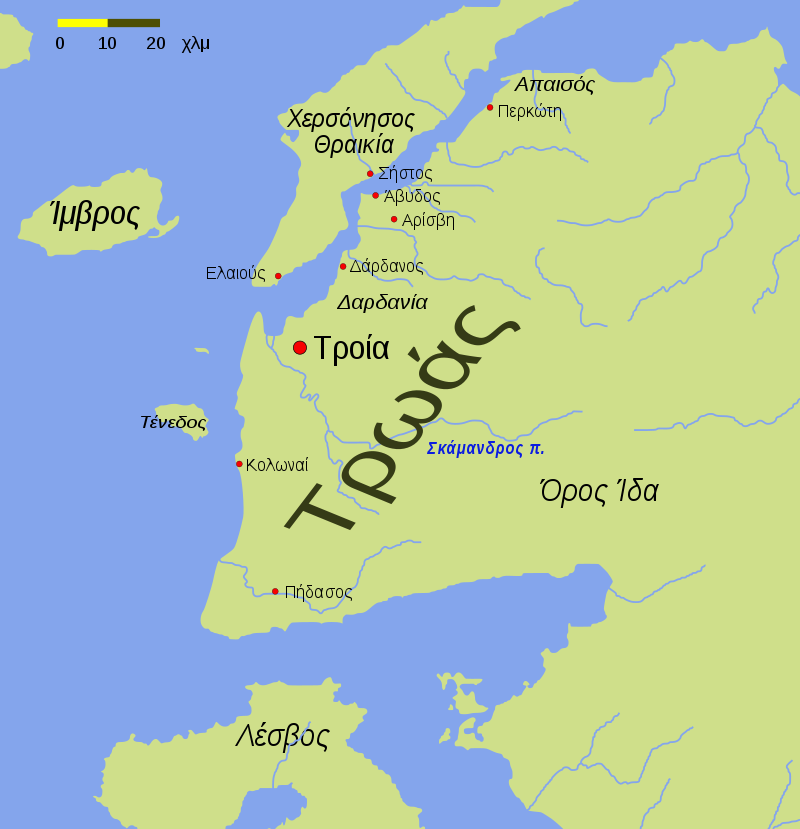 Σχ. 1 Φ 1-33 Μα όταν στου καλοτρεχούμενου του ποταμού φτάσαν2 το πέρασμα, στου Ξάνθου3 με τα στροβιλιζόμενα νερά που ο αθάνατος τον γέννησε ο Δίας, εκεί τους χώρισε…