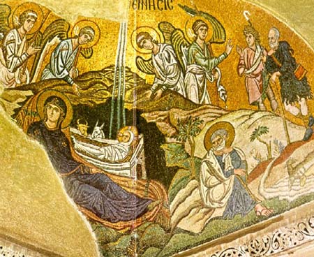 Όπως σε όλη γενικά τη βυζαντινή εικονογραφία της Γέννησης του Χριστού, έτσι και στο ψηφιδωτό στο Δαφνί (στο νοτιοανατολικό ημιχώνιο του καθολικού) η σκηνή του θείου συμβάντος ακολουθεί τα χαρακτηριστικά…