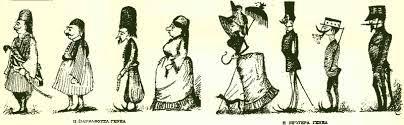 Η γενεαλογία αυτών των σκηνικών χαρακτήρων της ντοπιολαλιάς εξελίσσεται σταδιακά και ξεκινάει με τα «Κορακιστικά» (1813), όπου εμφανίζονται Γιαννιώτες (με τα ρουμελιώτικα), Κυπριώτες, Χιώτες (εκτός από τον υπηρέτη Μικέ) και Μυτιληνιοί, στον μολιερικό «Φιλάργυρο» στη μετάφραση του Κωνσταντίνου Οικονόμου εξ Οικονόμων (1816) υπάρχει ο πρωταγωνιστής με ελαφρά σμυρνέικα, πιο βαριά η κερα-Σοφουλιώ, ο υπηρέτης Στροβίλος με τα χιώτικα και ο μάγειρας κυρ-Γιάννης με τα «θεσσαλικά» (προδρομική μορφή για τα «ρουμελιώτικα» του Μπαρμπα-Γιώργου)[14]. Στις τελευταίες σκηνές του «Τυχοδιώκτη» του Μιχ. Χουρμούζη (1835) εμφανίζονται πολύ σύντομα ο Κρητικός, ο Υδραίος με τα αρβανίτικά του, ο Μανιάτης, ο Επτανήσιος, ο Στερεοελλαδίτης, ο Τσάκωνας, ο Βούλγαρος και ο Αθηναίος[15]. Το αποκορύφωμα αυτής της πρώτης φάσης της γλωσσική σάτιρας ήταν όμως η «Βαβυλωνία» (1836) του Χατζηασλάνη Βυζάντιου με την τεράστια διαχρονική επιτυχία που είχε το έργο, όπου η ιδιωματική τυπολογία των σκηνικών χαρακτήρων αποτελείται, πέρα από τον σοφολογιότατο διδάσκαλο, από τον Ανατολίτη με το φαντασιακό του ιδιόλεκτο, δύο Χιώτες, τον Κρητικό, τον Αλβανό, τον Επτανήσιο αστυνομικό, τον Πελοποννήσιο και τον Κύπριο[16].
