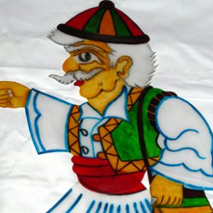 Tο ενδιαφέρον, γι’ αυτό το σύντομο μελέτημα, στοιχείο είναι, πως μαζί με την περιφερειακή μορφή του σκηνικού χαρακτήρα υιοθετείται από το θέατρο σκιών και η σχετική παράδοση του φτιαχτού θεατρικού ιδιώματος που χειρίζονται και που δηλώνει, δήθεν, τη γεωγραφική τους καταγωγή. Aπό τα πιο σημαντικά πορίσματα της εξέτασης του γλωσσικού αυτού υλικού είναι το γεγονός, πως το “θεατρικό” ιδίωμα και το πραγματικό πολύ σπάνια συμπίπτουν σε μεγάλην έκταση. Δίπλα σε σφάλματα, συγχύσεις, παρεξηγήσεις, ευρύτερη ή γενικότερη γεωγραφική εντοπιότητα ενός χαρακτηριστικού στοιχείου κτλ. υπάρχουν και δραματουργικές στρατηγικές και ανάγκες, που οδηγούν αναπόφευκτα στην επιλογή (για να μην κουράζεται το κοινό και οι ηθοποιοί) και στην εστίαση στο πιο εύκολα αναγνωρίσιμο λεξιλόγιο, σε λέξεις ή εκφράσεις που δίνουν couleur locale, με την επιβολή του ηθογαφισμού και παροιμίες, τραγούδια, ανέκδοτα, αλλά και εξωγλωσσικά στοιχεία, όπως ενδυμασία, έθιμα, αξίες και συμπεριφορές. ‘Oλα αυτά είναι αμέσως κατανοητά αν σκεφτούμε, για μια στιγμή μόνο, τον Mπαρμπα-Γιώργο.