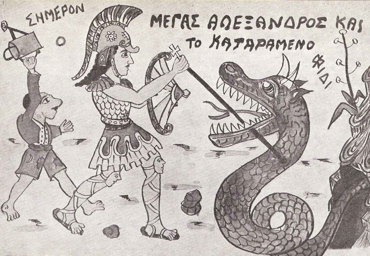 Τελείως διαφορετική ήταν η τύχη του θεάτρου σκιών στην Ελλάδα. Η υπόθεση της ύπαρξης της ηπειρώτικης παράδοσης, που παρά τις αμφισβητήσεις ορισμένων[33] φαίνεται πως ευσταθεί, με το να δημιουργεί τις ηρωικές παραστάσεις, μάλιστα δραματοποιώντας λογοτεχνικά έργα και με μια προσπάθεια δραματοποίησης των έργων με πρότυπο το θέατρο[34] και με την πολύ αγαπητή παράσταση του «Μεγαλέξαντρου και του καταραμένου φιδιού»[35], η οποία συνδυάζει πλέον διάφορες διαστρωματώσεις του ελληνικού λαϊκού πολιτισμού (τις παραδόσεις για τον Μεγαλέξαντρο, το τραγούδι του Αγίου Γεωργίου, το παραμύθι του δρακοντοκτόνου ήρωα και την εικόνα του Αγίου Γεωργίου με τον δράκοντα), φαίνεται πως είναι το πρώτο βήμα για τον εξελληνισμό του οθωμανικού θεάματος[36].