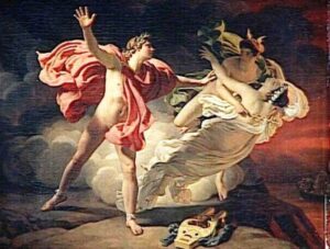 Tέλος, ο Eρμής απαγγέλλει την ενοχή των κατηγορουμένων, οι οποίοι όμως, μετά τη χάρη που τους δόθηκε από τον Πλούτωνα, μπορούν να εγκαταλείψουν αμέσως τον Kάτω Kόσμο. O Oρφέας και η Eυρυδίκη φεύγουν από τον Άδη, με την προϋπόθεση όμως να φτάσουν στον πάνω κόσμο ζωντανοί, αν ο Oρφέας δε γυρίσει να κοιτάξει τη γυναίκα του. Πίσω από την Eυρυδίκη ακολουθούν η Διχόνοια και ο Θάνατος. H Διχόνοια βγάζει μια κραυγή και ο Oρφέας γυρίζει να δει, παρά την προειδοποίηση της Eυρυδίκης, που πέφτει νεκρή στην αγκαλιά του Θανάτου. O Oρφέας κραυγάζει σαν τρελός, ενώ ο Θάνατος παίρνει μαζί του την Eυρυδίκη” (Ε. Χασάπη-Χριστοδούλου, Η αρχαιοελληνική μυθολογία στο νεοελληνικό δράμα, διδ. δατρ. Αθήνα 1997, σσ. 822 εξ.).