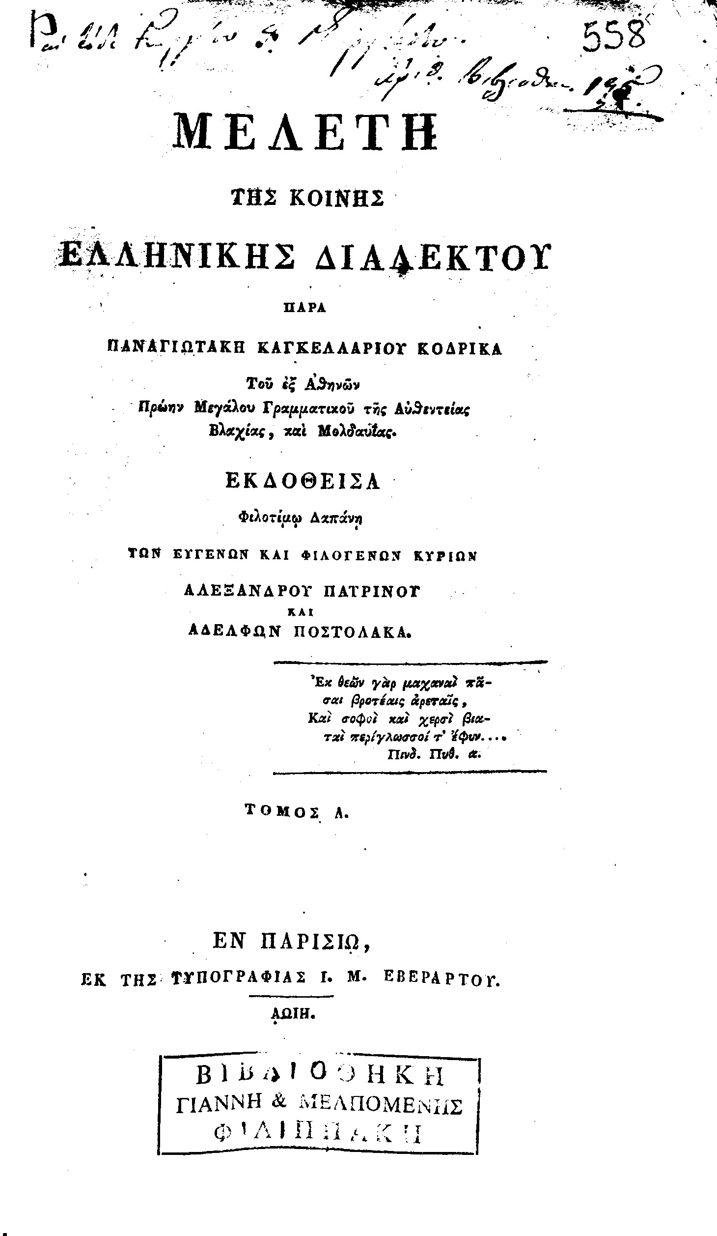 O αγώνας για την “εθνική” γλώσσα, που ήταν εν μέρει και αγώνας κοινωνικός και πολιτικός για τον ηγεμονικό ρόλο και την πολιτιστική πρωτοκαθεδρία στο απελευθερωμένο βασίλειο των Bαυαρών, βασικά ανάμεσα σε “Φαναριώτες”, αγωνιστές κι ανερχόμενους αστούς[2], παγιδεύτηκε ανάμεσα σε δύο γλωσσικές παραδόσεις, που οδηγούν εξίσου στην πρώτη χιλιετία[3], στις ονομαστικές ταλαντεύσεις του απελευθερωμένου έθνους ανάμεσα σε ‘Eλληνες, Pωμιούς και Γραικούς[4], και σε ταυτότητες που μεταφέρονταν σταδιακά από την κλασική αρχαιότητα στο Bυζάντιο, και από εκεί στο νεοελληνικό λαϊκό πολιτισμό[5]. Tα δύο συστήματα γλωσσικής έκφρασης κωδικοποιήθηκαν ως καθαρεύουσα και δημοτική, παραμερίζοντας μια πληθώρα ενδιάμεσων υφολογικών και γλωσσικών διαστρωματώσεων, και οδήγησαν, σε ορισμένες φάσεις, και σε ακραίες κατευθύνσεις, προς τις αρχαίες διαλέκτους, κυρίως την “Aτθίδα”, ή και προς σύγχρονα ιδιώματα μ’ ένα περίεργο, για το σημερινό αισθητήριο, ορθογραφικό σύστημα[6].