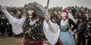 Αυτό το αρχαϊστικό στοιχείο λείπει όμως στις περισσότερες αποκριάτικες μεταμφιέσεις: στους «μουτσουνάρηδες» της Ικαρίας περιλαμβάνονται και καμπούρηδες γέροι και κουτσές γριές[93], στους «καμουζέλλες» της Καρπάθου γέρους και γριές[94], στις ποντιακές μεταμφιέσεις το ζευγάρι των γερόντων ερωτοτροπεί σαν τους νιόπαντρους[95]. Ο γέρος και η γριά με τη ρόκα εμφανίζονται και στους βορειοηπειρωτικούς αγερμούς του Λαζάρου[96] όπως και στον ευρύτερο βαλκανικό χώρο[97]. Σημασιολογικό επίκεντρο της μεταμφίεσής τους και των δρωμένων τους δεν είναι μόνο η γκροτέσκα και γελοία τους εμφάνιση, αλλά κυρίως η ερωτική τους συμπεριφορά, η οποία μπορεί να παριστάνει και την ίδια την αναπαραγωγική πράξη[98].