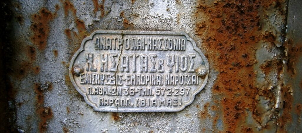 Η μια καρότσα δείχνει γεροντότερη από την άλλη. Τα παραπέτα της είναι από σανίδες που κάποτε ήταν βαμμένες με μπλε και άσπρη λαδομπογιά και στο πάνω μέρος είχε έναν σιδερένιο σκελετό όπου , προφανώς, έμπαινε κάποια τέντα ή μουσαμάς. Το κοτετσόσυρμα με το οποίο είναι επενδυμένα, εσωτερικά, τα παραπέτα, ίσως παραπέμπει σε κάποια περίοδο της ζωής της, που έγινε κοτέτσι. Στο πλάι της είναι γραμμένα, με καλλιγραφικά αλλά μισοσβησμένα γράμματα, τα στοιχεία της ταυτότητάς της, ο τύπος του οχήματος, το ωφέλιμο φορτίο, το απόβαρο, η έδρα κι ένα τηλέφωνο για κάθε ενδιαφερόμενο τής τότε εποχής: