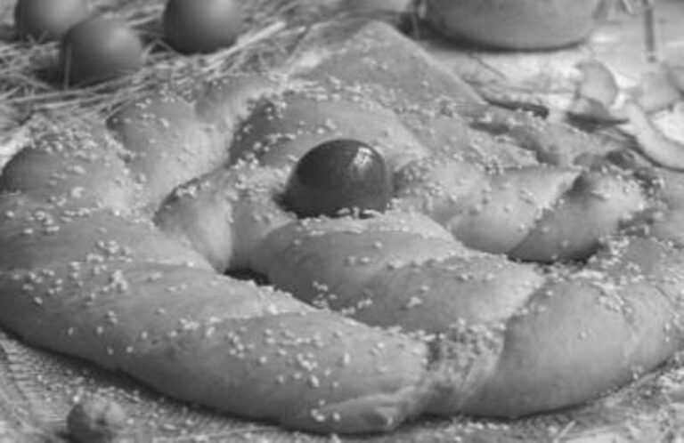 Ἤρχετο ἡ Μεγάλη Πέμπτη καὶ αὐτὴ ἄναφτε τὴν φωτιάν της, ἔστηνε τὴν χύτραν της, κ᾽ ἔβαπτε κατακκόκινα τὰ πασχαλινὰ αὐγά. Ὕστερον ἡτοίμαζε τὴν λεκάνην της, ἐγονάτιζεν, ἐσταύρωνε τρεῖς φορὲς τ᾽ ἀλεύρι, κ᾽ ἐζύμωνε καθαρὰ καὶ τεχνικὰ τὶς κουλοῦρες, κ᾽ ἐνέπηγε σταυροειδῶς ἐπάνω τὰ κόκκινα αὐγά.