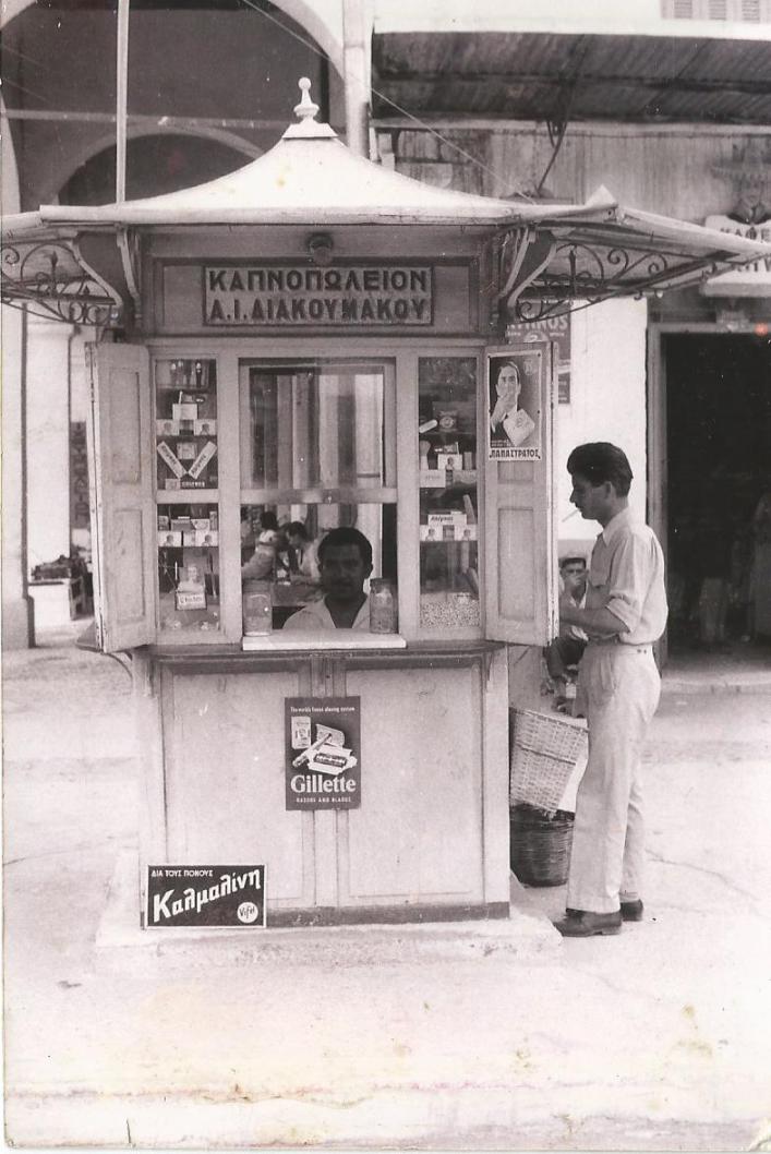 Δεκαετία 1950: Το ιστορικό περίπτερο ΔΙΑΚΟΥΜΑΚΟΥ, στη γωνία Παλαιολόγου και Ευαγγελιστρίας. Μέσα διακρίνεται ο περιπτεράς Νίκος Διακουμάκος
